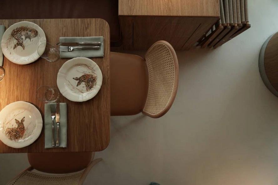 В ресторане используется посуда французской мануфактуры Gien (коллекции Sologne, Les Filets и Dominote с ручной росписью). Ольфакторное оформление пространства, для заведения разработан специальный аромат с нотами шалфея.
